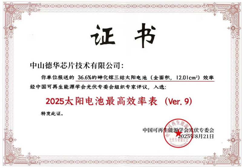 中山德华芯片研制的全柔性卷迭式太阳翼中均使用了GaInP/GaAs/GaInAs三结太阳电池,该电池的各个子电池电流完美匹配,光子利用率极高,温度系数更好,量产实测在轨效率达33.5%。