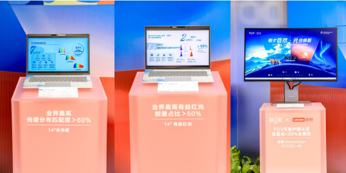 京东方14英寸全光谱笔记本拥有63%业界领先光谱分布匹配度;14英寸有益红光笔记本实现50%有益红光能量占比,可改善血液循环,并对近视抑制有一定作用,从“被动减害”升级为“主动增益”。联想ThinkVision P27QD-40以“好屏看得见,性能再跃升”为核心理念,可以将有害蓝光降低到35%以下,并获得TÜV莱茵眼部舒适度(5星)认证、EyeSafe 2.0认证,为企业办公定制视觉新标准。
